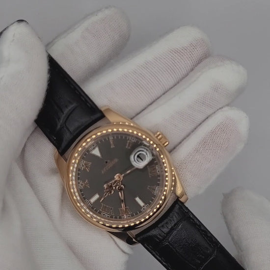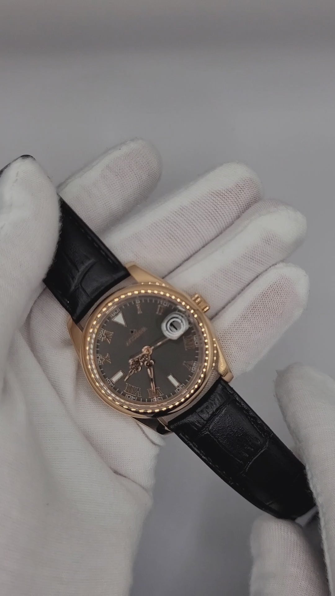 The Avicenna Aura RG1 brings a touch of timeless luxury with its polished 36mm rose gold stainless steel case, protected by sapphire crystal and enhanced with a magnifier glass for effortless date readability.