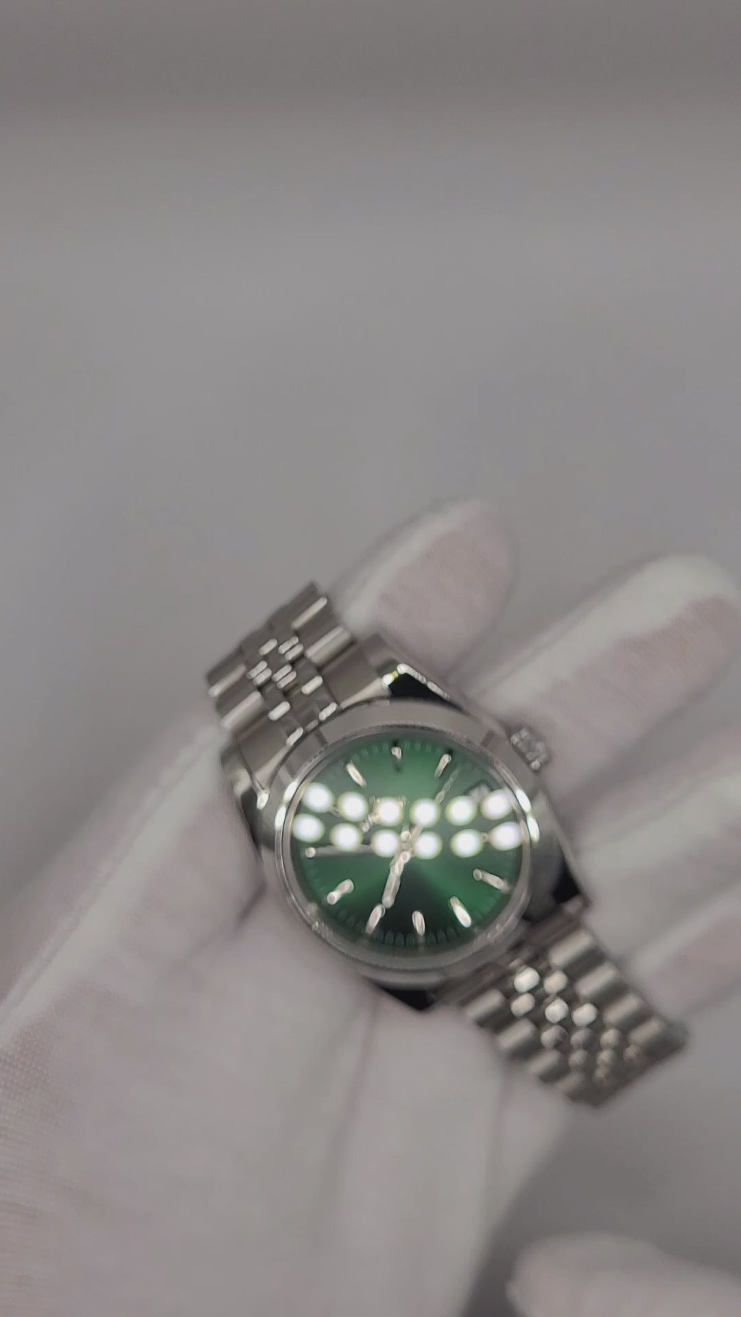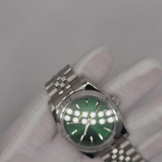 At its heart lies a radiant sunburst green dial, capturing light in shifting tones of emerald and forest, finished with polished metal indices that lend depth and character. The hands feature a vivid green lume, offering clear visibility long after the sun sets.